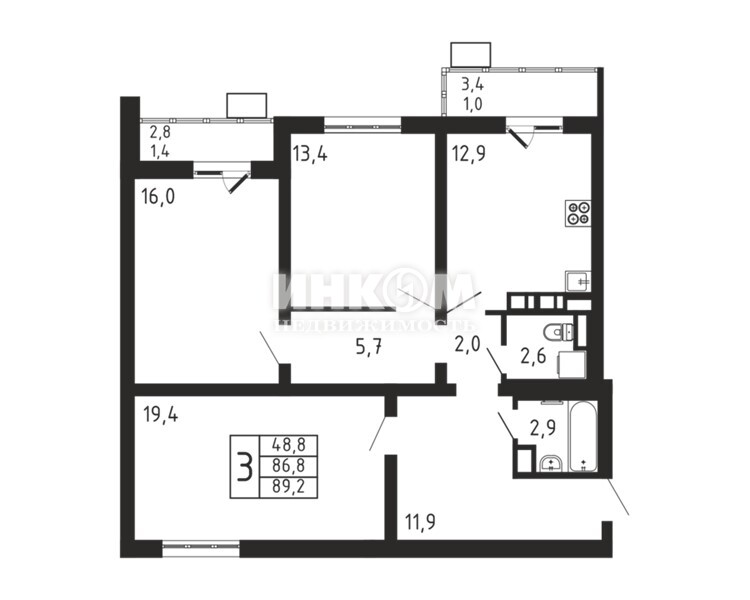 Продажа 3-комнатной квартиры, 89.2 м², этаж 2/9