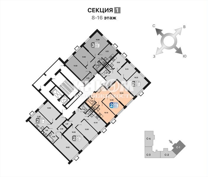 Продажа 2-комнатной квартиры, 52 м², этаж 14/16