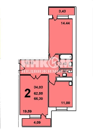2-комнатная квартира, 8 этаж, 63.4 м2
