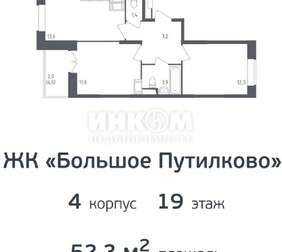 2-комнатная квартира, 52.3 м², этаж 19/20